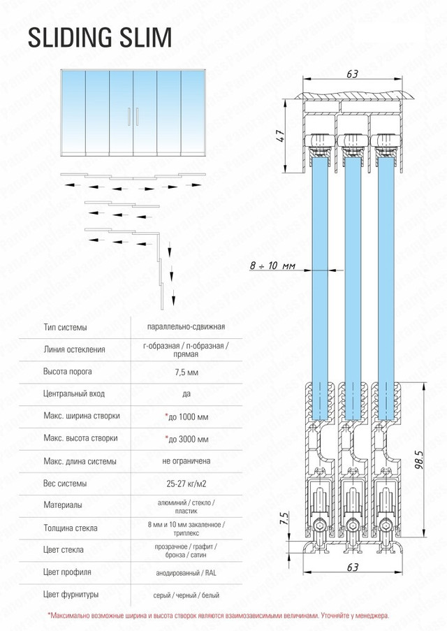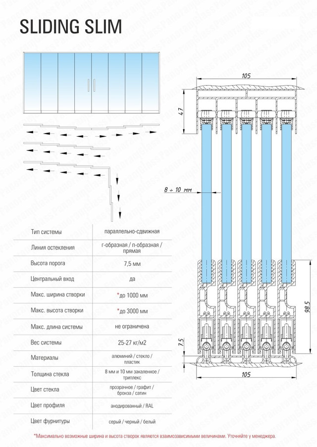 ​​​​​​​​​​​​Простая и удобная система безрамного остекления SLIDING SLIM с параллельным движением створок предназначена для безрамного остекления беседок, веранд, террас, павильонов, летних веранд ресторанов, а также создания интерьерных стеклянных перегородок внутри помещений. Система имеет низкий порог высотой всего 7,5 мм. Он совсем не мешает во время ходьбы. Створки системы двигаются в зависимости, они сцеплены друг с другом. При открывании системы первая створка вытягивает за собой все остальные.