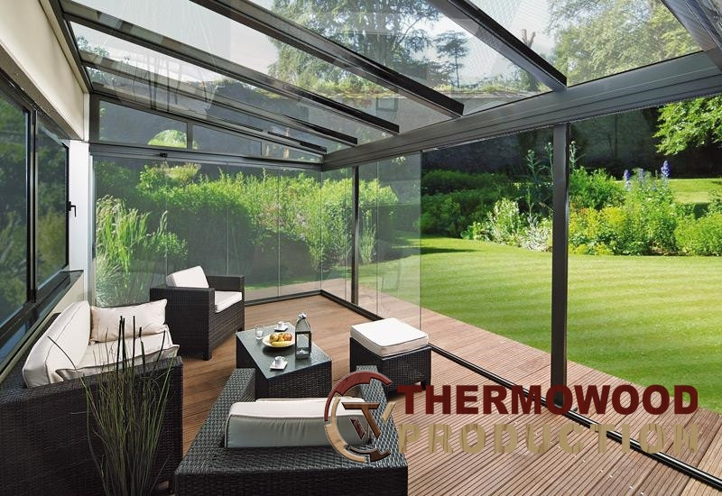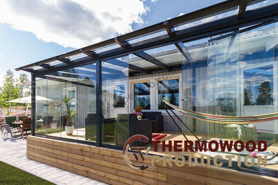 Стеклянные террасы, беседки, веранды из алюминиевых окрашенных профилей, проемы заполняются раздвижными, складными, гильотинными системами. Крыша интегрирована в каркас с водоотводами в стойках. Крыша может заполняться моностеклом (триплекс) и стеклопакетами. Крыша также может быть раздвижной (моторизированной). Такую крышу можно применить и в деревянной беседке полностью или частично. Все проемы при необходимости оборудуются рефлексолями (маркизами) - солнцезащитными системами.